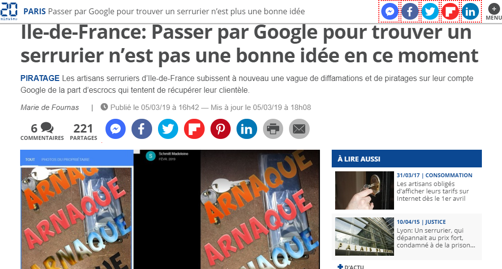 Suite à la mobilisation de notre Label auprès de Google face aux diffamations de certains de nos serruriers par des escrocs, 20 Minutes Paris a rapporté les événements. Ces derniers jours, une vaste campagne de spams a été orchestrée dans le but de nuire aux pages Google Business de nombreux serruriers, dont certains font partie de notre association.
